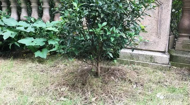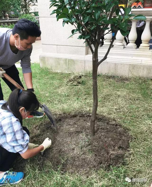 将枯萎的草皮铲除并将树穴以圆形向外扩展一圈