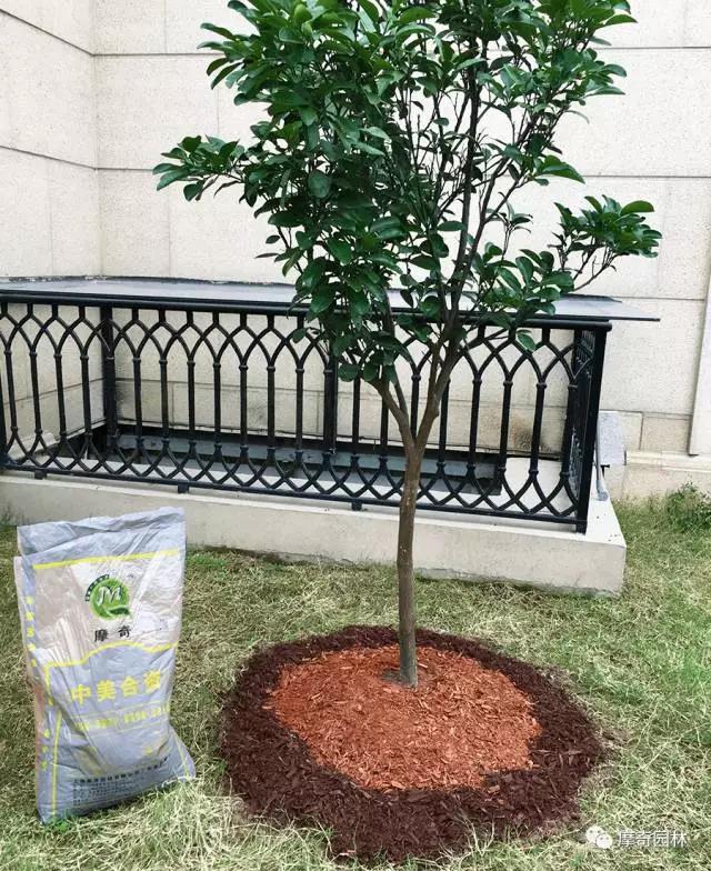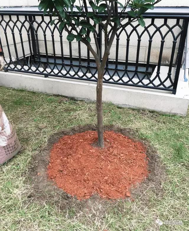 矮灌木植株比较小以棕色摩奇有机覆盖物做一个单色圆形树穴即可