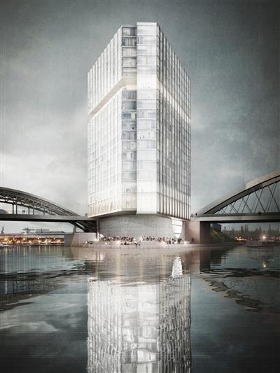 Barkow Leibinger为法兰克福海滨设计了三角形的“灯塔”酒店和公寓